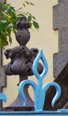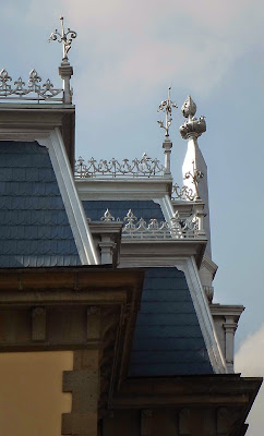 Los complejos remates -de hoja de plomo moldeada-- que rematan el perfil de la casa muestran filigranas con flores de lis, cresterías y florones que delinean la buhardilla de tejas metálicas que ahora se muestran pintadas de azul y que años atrás fueran verdes.