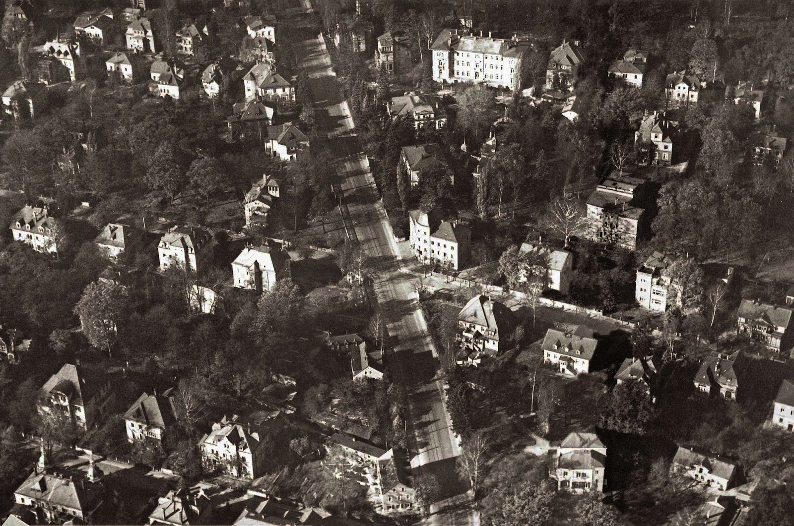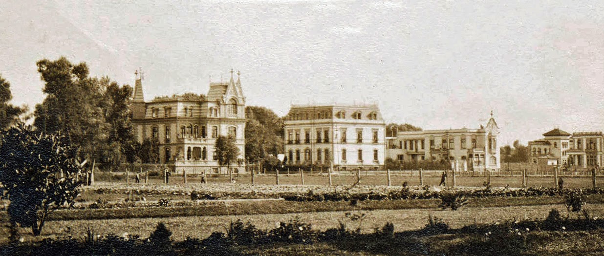 Volviendo a la arquitectura de la casa, es de destacar el ornamentado techo a manera de mansarda (nombre que proviene del francés “mansarde” que a su vez se debe al arquitecto parisino François Mansart (1598-1666), quien lo popularizó en Francia para burlar la reglamentación que limitaba la altura de los edificios; tiempo después su sobrino nieto Jules Hardouin Mansart prestigió esta especie de techo muy inclinado al utilizarlo en el Palacio de Versalles y lo transformó en elemento de distinción-) que corona la construcción y que es probablemente el elemento urbano más distintivo; esa arquitectura pretendía modificar la tradición española que la Ciudad de México mantenía en sus zonas urbanas al crear edificios exentos –libres de colindancia- que daban la impresión de ser un entonces novedoso “Jardín edificado”. Para entenderlo, puede verse la fotografía de abajo que corresponde al “Dersden-Blasewitz” en una imagen tomada en los años treinta y que ejemplifica la idea de “Ciudad Jardín”...