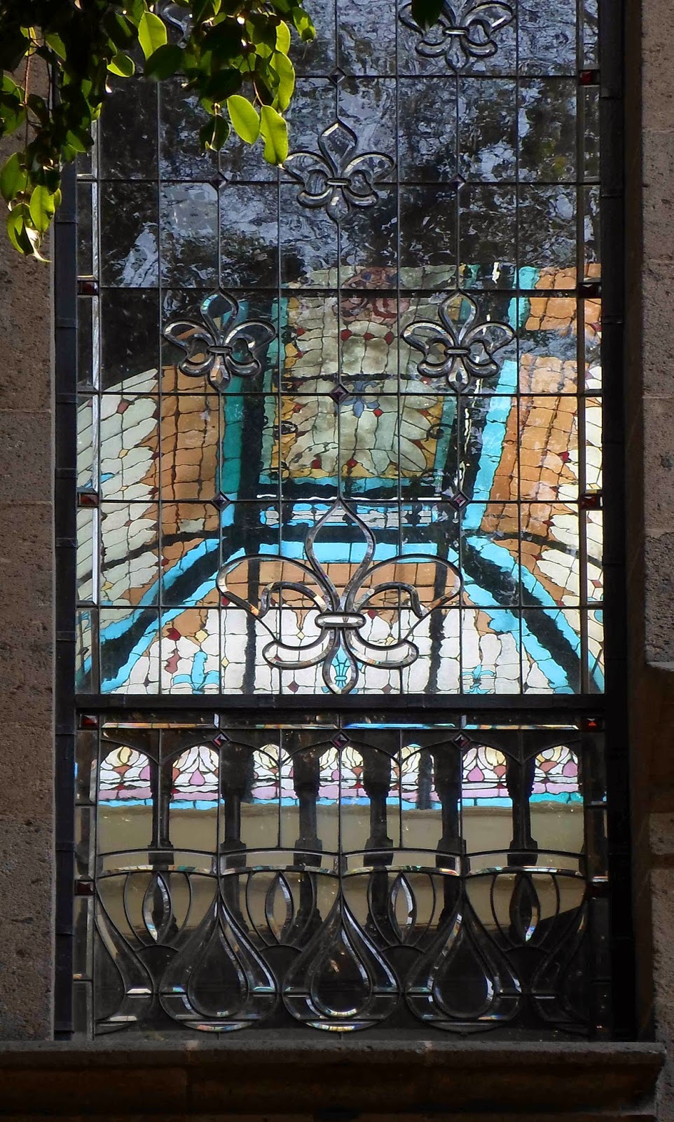 Arriba, los arcos de la terraza norte --que permite la salida al jardín—y sus vitrales con decoraciones de flor de lis; abajo detalle de cantera y herrería con variantes del mismo motivo.